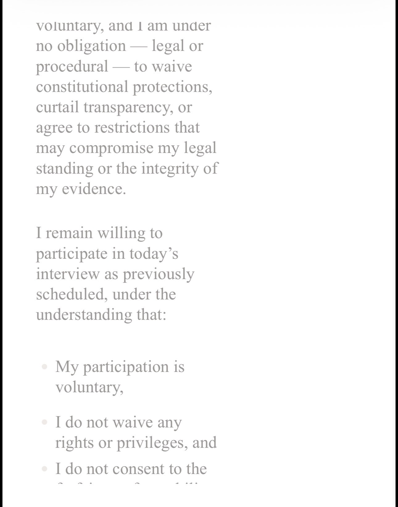 Third section of my written objection stating that my participation was voluntary, that I would not waive rights or privileges, and that I would not consent to restrictions compromising my ability to protect myself without legal review.