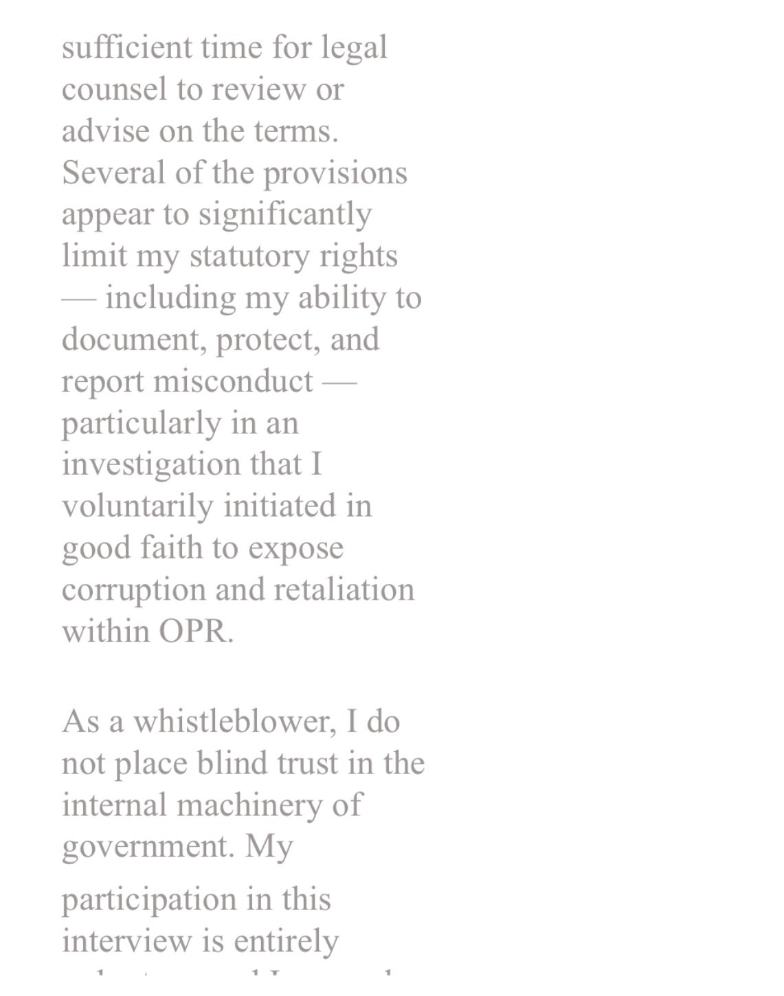 Second section of my written objection stating that several provisions appeared to limit my statutory rights, including my ability to document, protect, and report misconduct in an investigation I had voluntarily initiated.