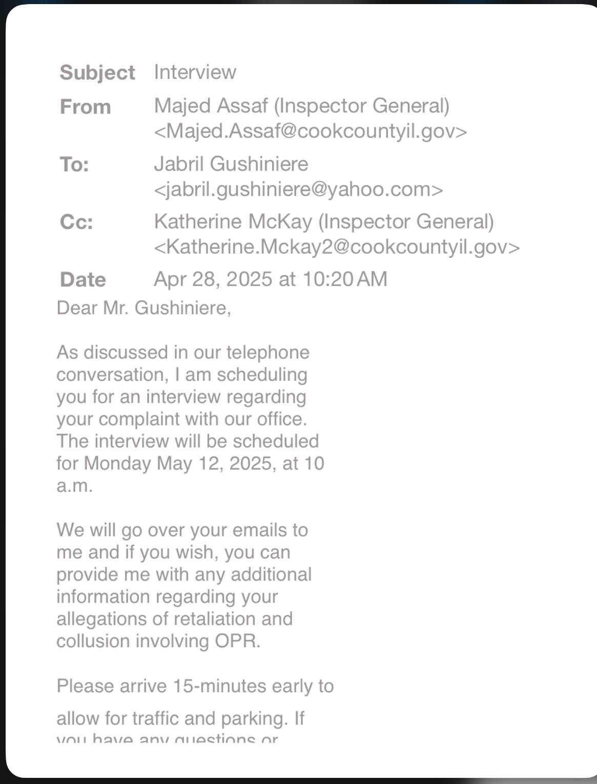 Email from Majed Assaf scheduling the interview for Monday, May 12, 2025 at 10:00 a.m. and instructing me to arrive 15 minutes early for traffic and parking, supporting my position that the interview was initially communicated as in person.