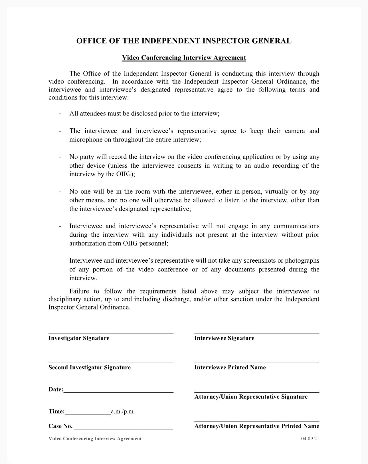 Cook County Office of the Independent Inspector General video interview agreement prohibiting recording, screenshots, and outside participation absent OIIG approval.