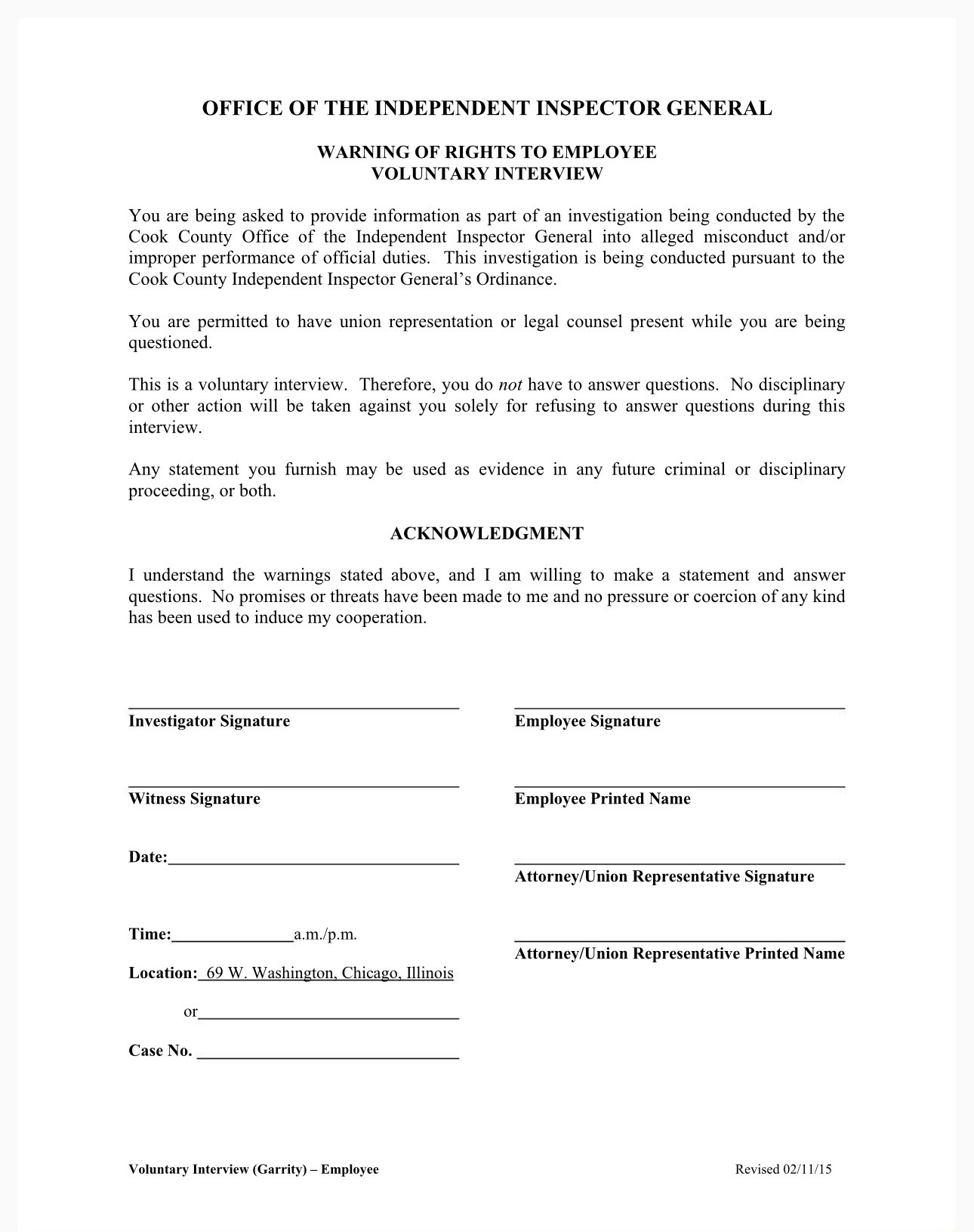 Cook County Office of the Independent Inspector General Garrity / voluntary interview warning form sent in connection with the scheduled interview.