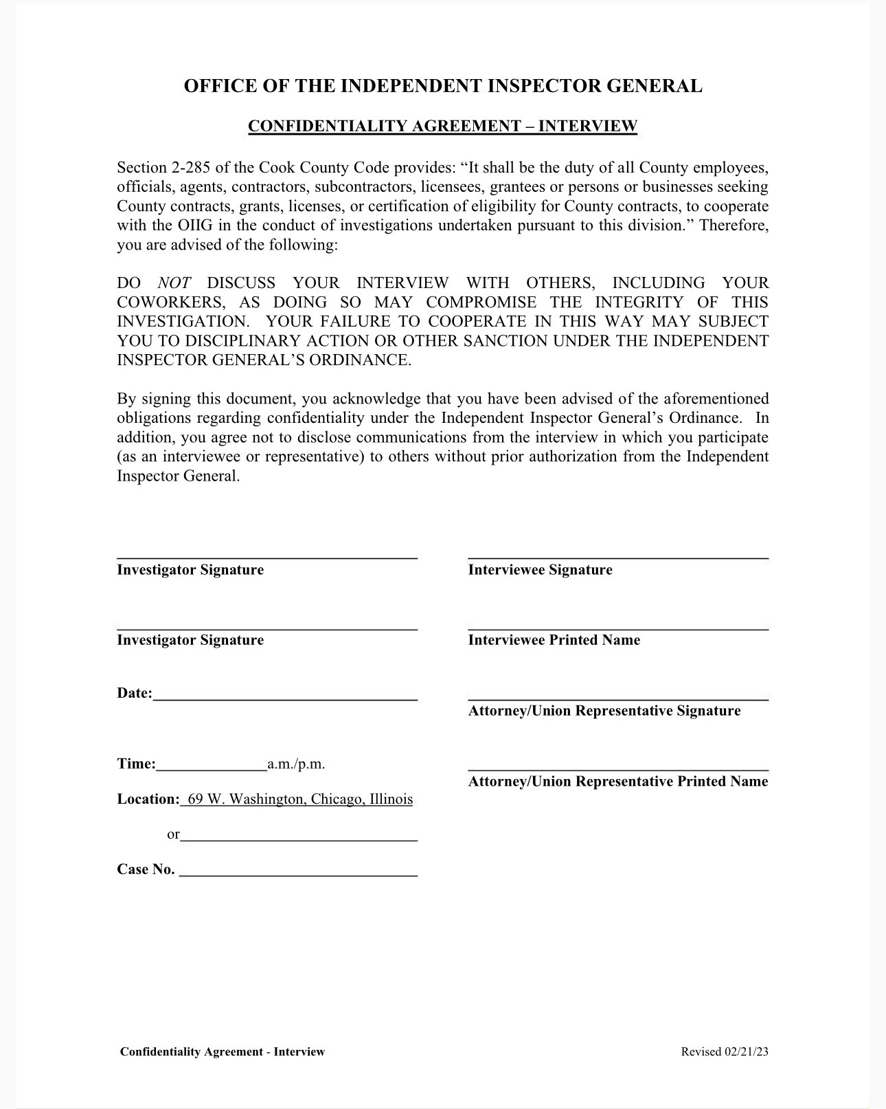 Cook County Office of the Independent Inspector General confidentiality agreement sent to me on the morning of the scheduled interview.