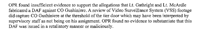 OPR finding stating there was insufficient evidence that Lt. Gathright and Lt. McArdle fabricated the DAF against me, while acknowledging that VSS footage captured me at the threshold of the tier door.