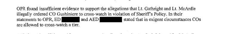 OPR finding stating there was insufficient evidence to support my allegation that Lt. Gathright and Lt. McArdle illegally ordered cross-watching in violation of Sheriff’s policy.